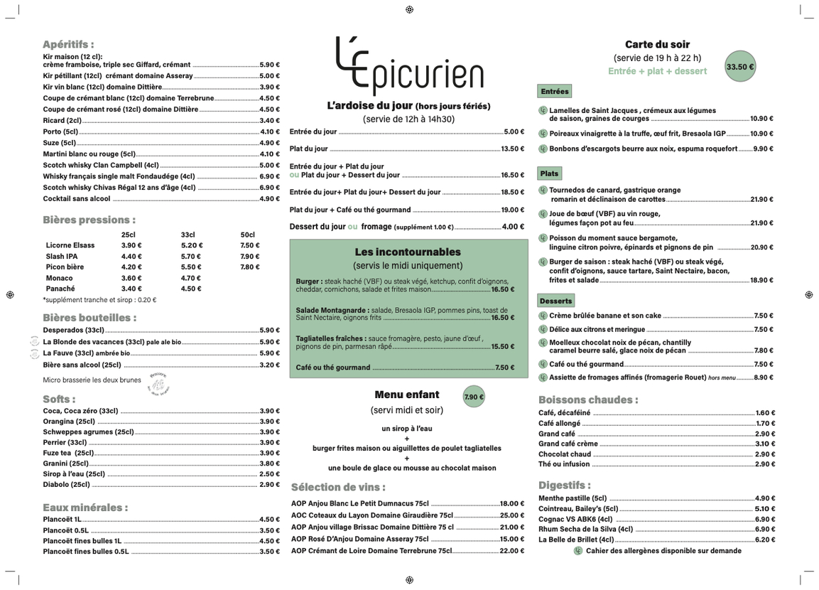 Chez L’Épicurien, notre carte reflète notre passion pour les produits de saison et notre envie de vous surprendre. Notre carte se compose en deux éléments : le Set de Table et l’Ardoise, pour vous offrir une expérience gustative toujours renouvelée.